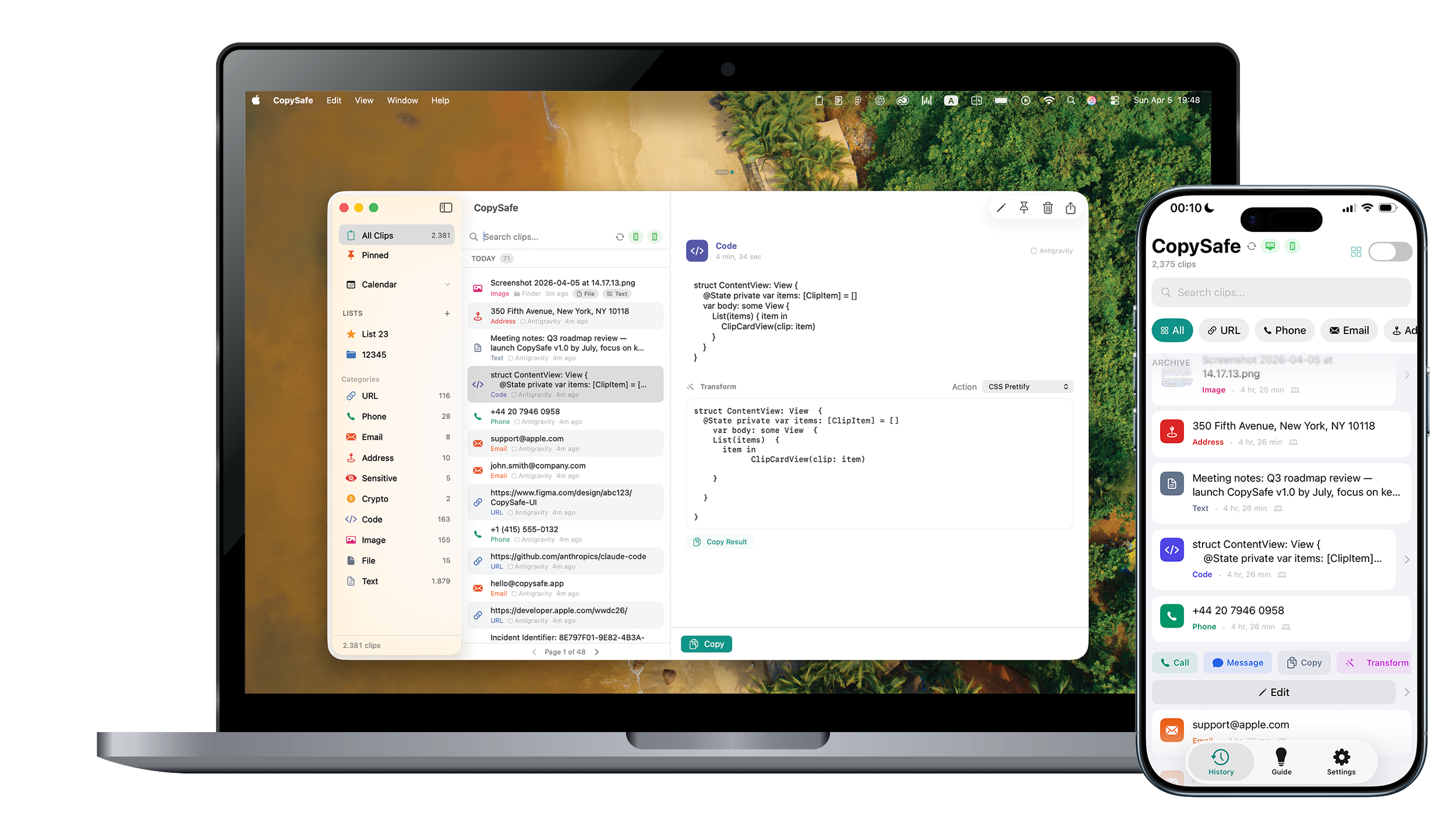 CopySafe is a clipboard manager for iPhone and Mac with local encrypted sync, history, and smart actions. No cloud required.