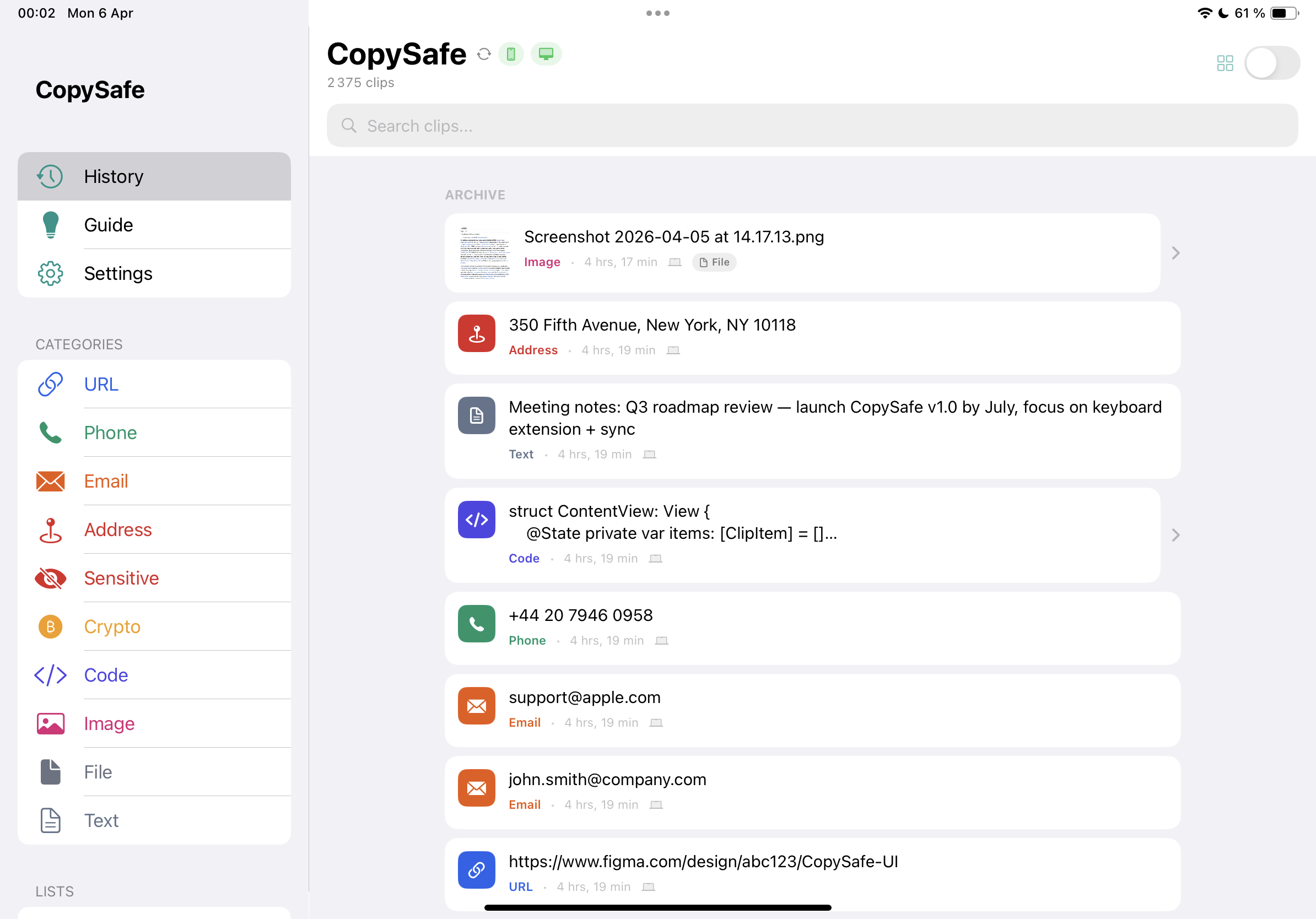CopySafe automatically captures everything you copy. On iOS, use the keyboard extension. On macOS, it monitors your clipboard in real-time.